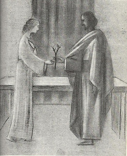 María hace ademán de coger su amplio manto cándido para colocárselo prendido a los hombros. Pero su prometido le precede en el gesto y le ayuda a fijar con dos hebillas de plata, en los hombros, este amplio manto suyo. Las maestras disponen los pliegues con amor y gracia.