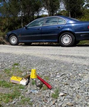 A un lado de la calzada se habían depositado tres rosas rojas, una botella de cava mediada, una caja grande de cerillas, todas quemadas, y dos cigarrillos, también consumidos. Al otro lado de la entrada en la pista, había una botella de tónica que contenía aguardiente, un puro, una vela roja y una caja grande de cerillas sin usar (en la foto).