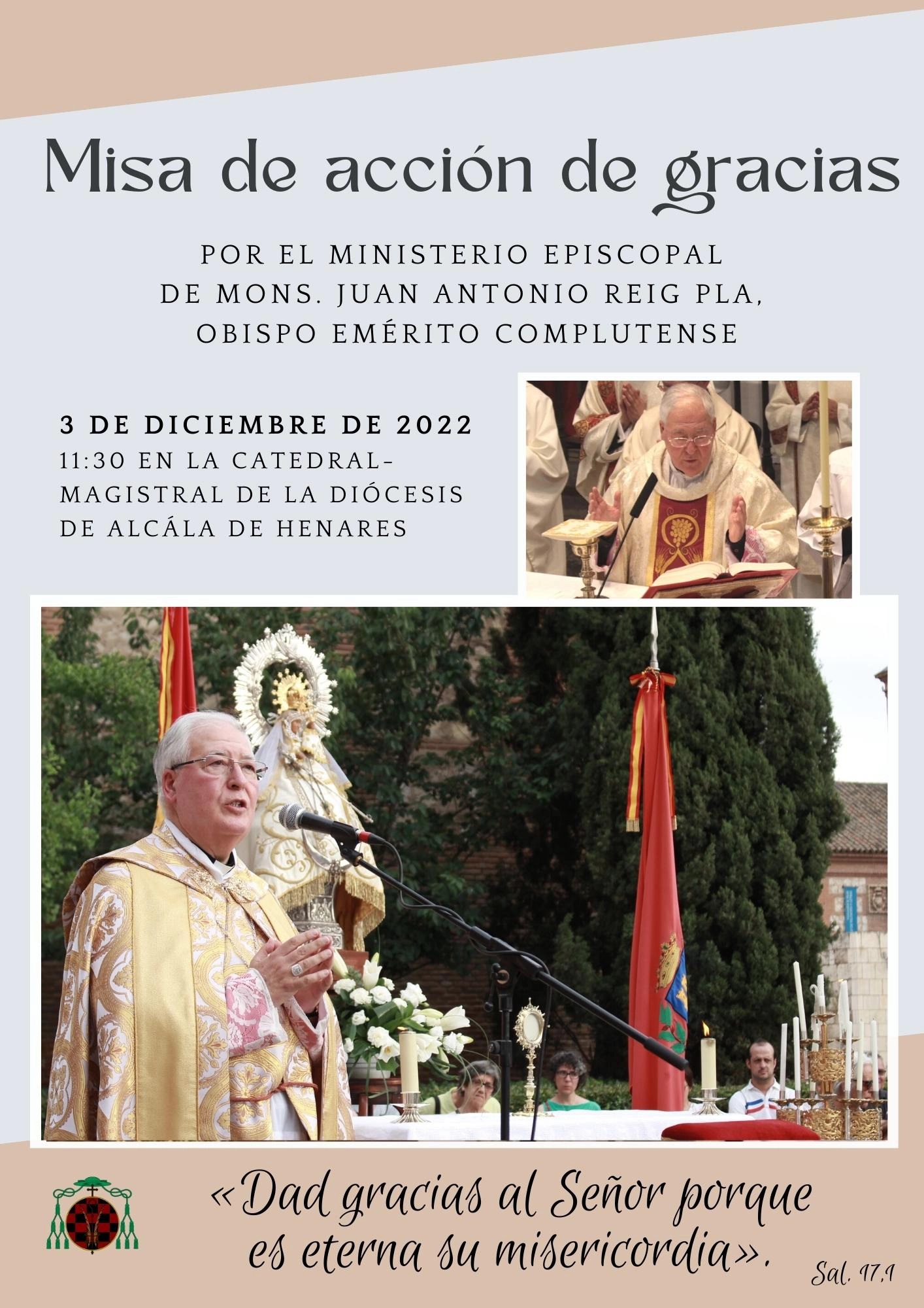Mañana sábado 3 de diciembre el obispo emérito de la diócesis de Alcalá de Henares, Mons. Juan Antonio Reig Pla presidirá a las 11.30h, en la catedral magistral de su diócesis, una misa de acción de gracias por el ministerio episcopal.