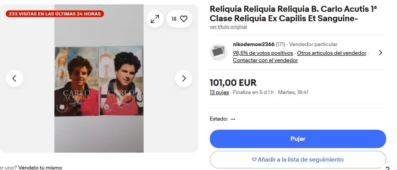 Al cierre de esta edición, Religión Confidencial ha podido hacer su propia investigación y ha podido constatar en la página de eBay de España una cantidad ingente de reliquias, incluidas algunas atribuidas a Carlo Acutis. Nikodemow2366 ofrece “cabello y sangre” de Acutis por 101 euros. La oferta ha recibido 13 pujas.