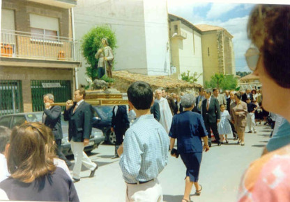 Veamos la escena. El santo a hombros de la gente del campo. Tras él, el señor cura párroco revestido de capa pluvial y lo que haga falta. Le sigue el mayordomo del santo con el cetro en la mano. Junto a él, el alcalde y demás fuerzas vivas como está mandado. Al lado, la banda de música que irá acompañando el cortejo. Hemos salido a la calle y estamos esperando que se organice la procesión en el siguiente orden: cruz alzada; gente a caballo, carros tirados por caballerías y mulas sobre los cuales van adultos y niños vestidos con el traje serrano. Después, los tractores adornados hasta decir basta y cargados de niños que ya no caben más. Y cuando ya han pasado estos, la banda de música, el santo, el cura, las autoridades, la gente… Bien, ¿eh?