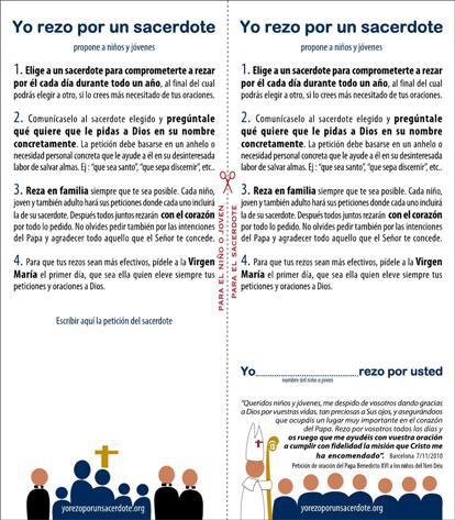 Se llama… ¡Qué más da cómo se llame! El caso es que se trata de una chiquilla que debe tener diez o doce años. El domingo entró en la sacristía al acabar la misa para contarme que en su colegio les han pedido el sacrificio y la generosidad de rezar DURANTE UN AÑO ENTERO por un sacerdote, y que ella había decidido rezar por su párroco.Es como un contrato. Un díptico con un troquelado en el medio. En una parte está su compromiso de oración con su firma. En la otra… ¡Ay en la otra! En la otra, en un espacio en blanco, me pidió que escribiera mi intención. Te quedas en blanco. Porque yo sé que Dios no puede dejar de escuchar la oración de una cría que insiste durante un año entero rezando por la intención de su párroco.