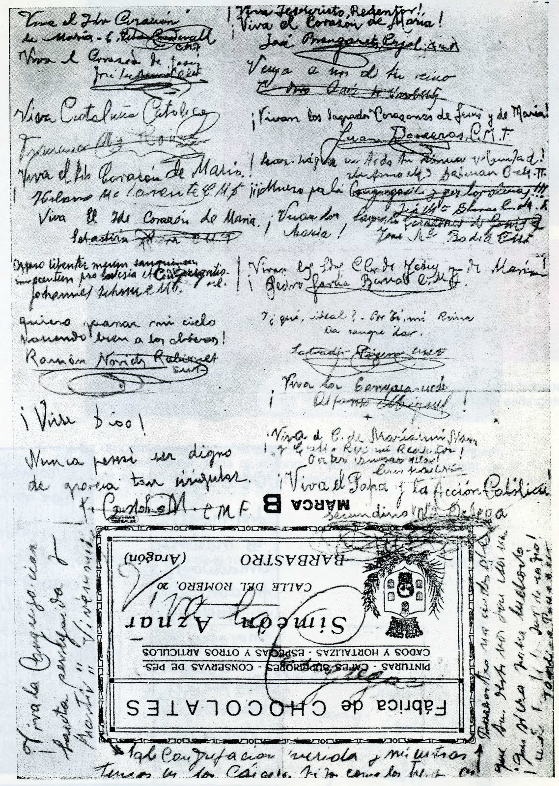 Francisco Castán Meseguer, de 25 años, nacido en Fonz (Huesca) en 1911, era hermano cooperador claretiano en Barbastro, donde fue asesinado el 15 de agosto de 1936; con otros 50 religiosos de esa orden fue beatificado en 1992. En la carta de despedida a su congregación, Castán escribió: “¡Viva Dios! Nunca pensé ser digno de gracia tan grande”, como puede verse en el comienzo (a la izquierda) de la segunda página del envoltorio de chocolates en que fue escrito el mensaje, que los dos argentinos que salvaron la vida llevaron a Roma.¿Para qué quiero ropa, si me van a matar?