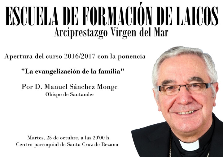 La apertura de curso corre a cargo de nuestro obispo D. Manuel Sánchez Monge, el próximo MARTES 25 de Octubre, a las 8 de la tarde, en el Centro Parroquial de Santa Cruz de Bezana, con la interesante ponencia de actualidad "La evangelización de la familia".