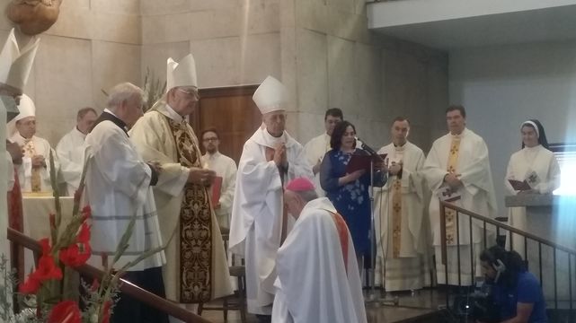 Después la súplica litánica (encomendarse a la intercesión de santos) se celebró la imposición de manos en la que el nuevo obispo recibió el anillo, la mitra y el báculo. Al finalizar, aplausos prolongados de los todos los congregados y abrazos al nuevo prelado.