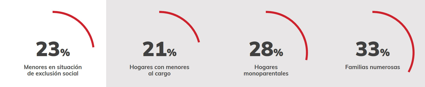 Según la última encuesta EINSFOESSA (Encuesta Sobre Integración y Necesidades Sociales de la Fundación FOESSA) de 2018 , el 23% de los menores de edad en nuestro país se encuentran en situación de exclusión social, lo cual implica que casi una cuarta parte de nuestra infancia está desarrollándose en un contexto de carencia o necesidad. Contar o no con menores a cargo en el hogar puede hacer la diferencia entre la exclusión y la integración, ya que en el actual escenario el 21% de los hogares con menores a cargo se encuentran en situación de exclusión (el 16% en los hogares sin menores), y esa cifra se eleva hasta el 28% cuando se trata de un hogar monoparental y al 33% si hablamos de familias numerosas.