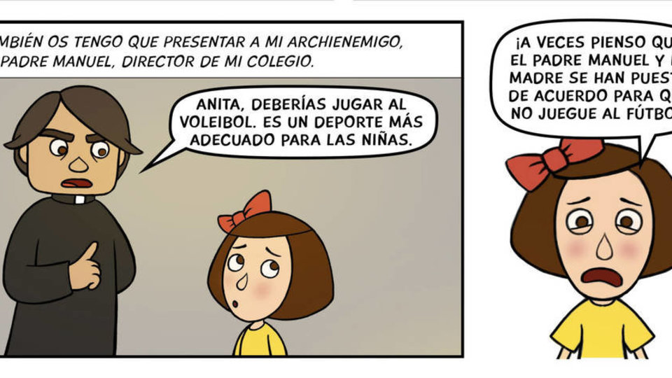 En una de las viñetas aparece un sacerdote, del que la niña protagonista nos dice: “También os debo presentar a mi archienemigo, el padre Manuel, director del colegio”. El sacerdote, perfectamente vestido con sotana y alzacuellos, enarbola un dedo recriminador y con gesto de enfado le dice: “Anita, deberías jugar al voleibol. Es un deporte más adecuado para las niñas”. En la última viñeta aparece Anita jugando al fútbol con un niño y una niña, siendo perseguidos los tres a la carrera por el padre Manuel, una vez más enojado.