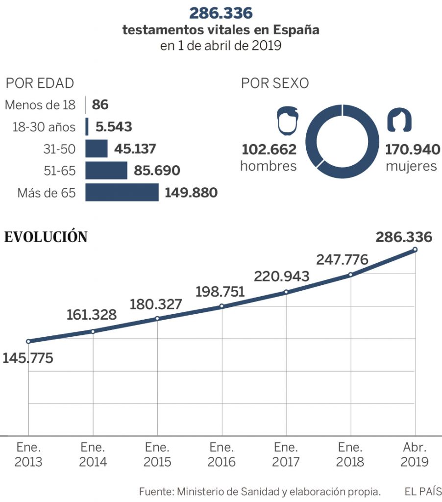 La mitad (el 52%) de los españoles con testamento vital, según el Registro Nacional de Instrucciones Previas, son personas mayores de 65 años, lo que puede suponer una preocupación mayor cuanto más cerca está la muerte. Más mujeres (60%) que hombres lo suscriben.