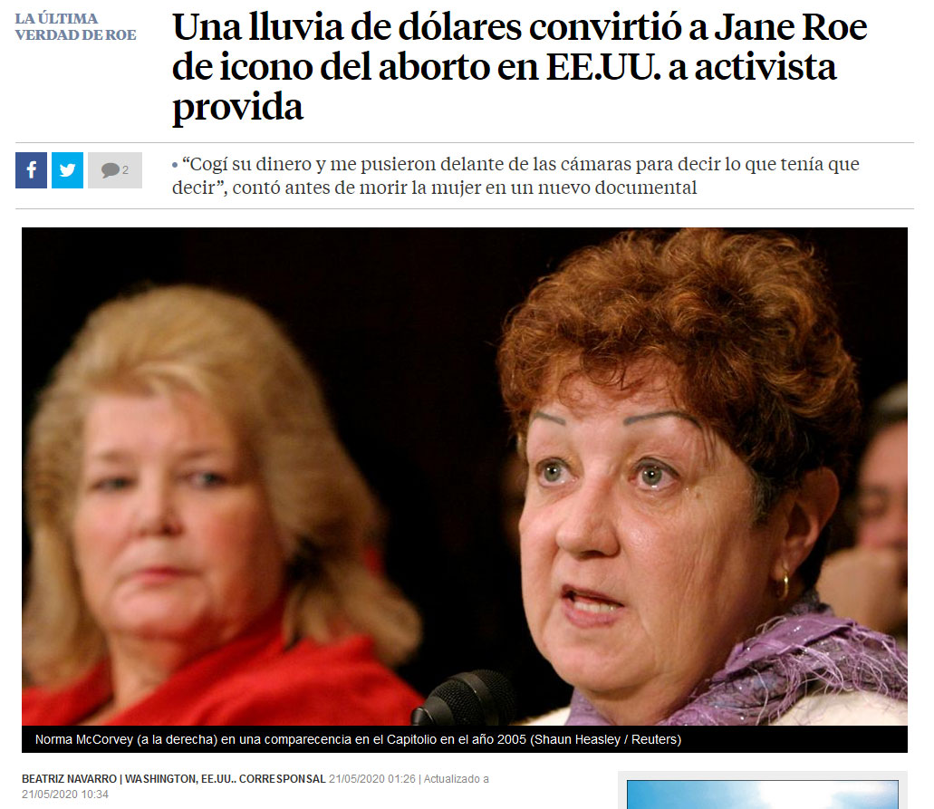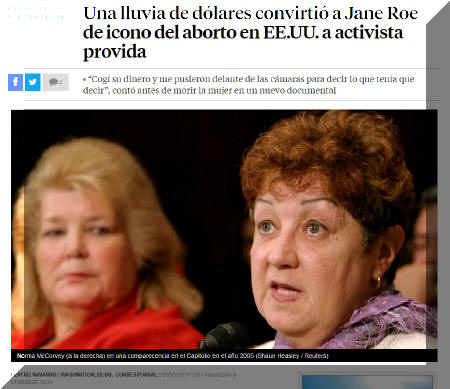 “Jane Roe fingió la conversión por dinero”, “Pagaron a Jane Roe para denunciar el aborto”, “Una lluvia de dólares convirtió a Jane Roe en activista provida“, “Pagaron a Jane Roe para cambiar su posición sobre el aborto”, “La conversión provida de Jane Roe fue una estafa”…
