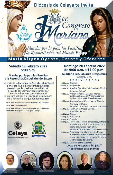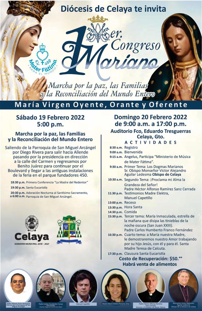 La organización Mater Fátima Peregrina organiza, con la colaboración de la Diócesis de Celaya, en México, el Primer Congreso Mariano: “María Virgen Oyente, Orante y Oferente”. Con este Primer Congreso Mariano se busca que los fieles puedan interiorizar, a ejemplo de la Virgen María, los pasos que deben seguir para llegar a ser apóstoles de los últimos tiempos y trabajar decididamente por el triunfo del Inmaculado Corazón de María.