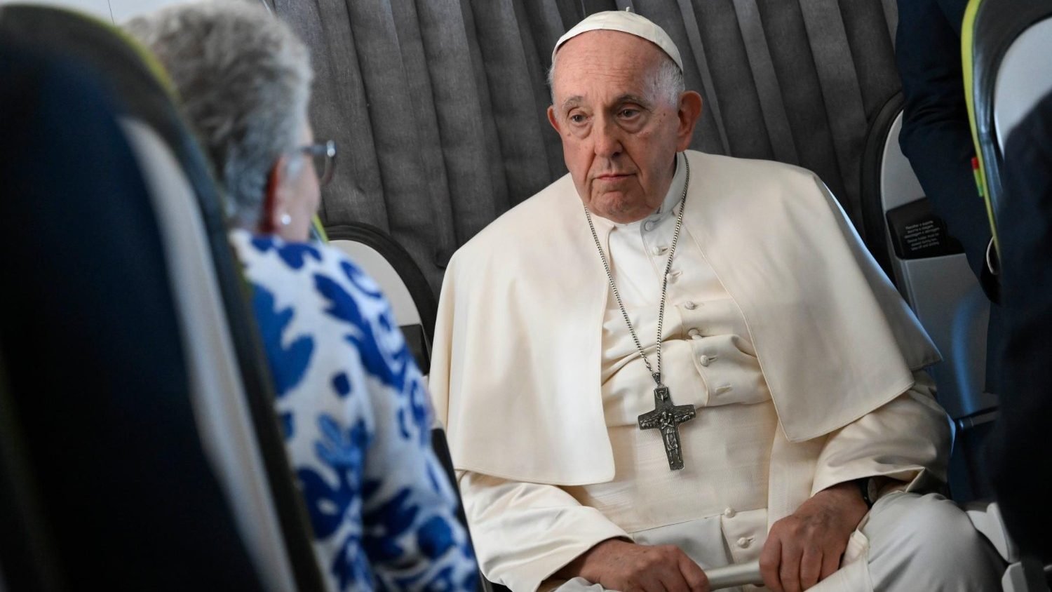El Papa Francisco durante la rueda de prensa en el avión en su vuelo de regreso de Lisboa.