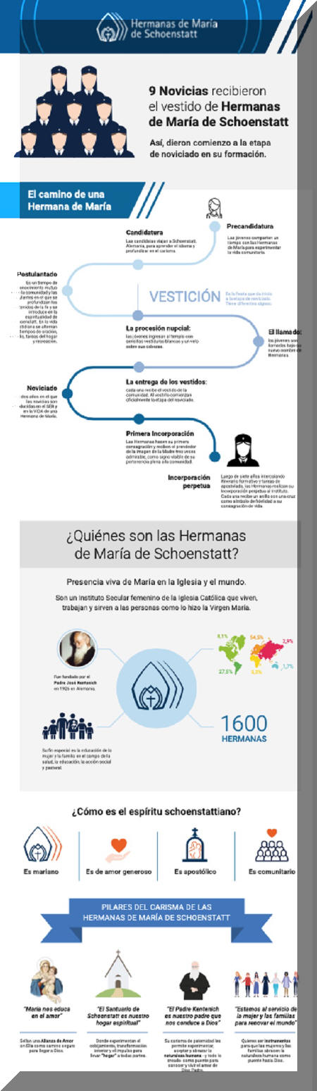 El pasado sábado, nueve jóvenes celebraron la ceremonia de vestición para dar inicio a la etapa del noviciado de las Hermanas de María de Schoenstatt en la Iglesia de la Santísima Trinidad en Monte Schoenstatt, Alemania. Ninguna de ellas son alemanas pero se consagran en el país. Se trata de María Elina (Argentina), Catalina (Argentina), Belén (Paraguay), Estrella (Paraguay), Goshia (Polonia), Christy (India), Margreate (India), Andrea (México) y Verónica (España), que "llegaron a la ceremonia contentas y emocionadas por dar un paso significativo en su camino de consagración", explica un comunicado.