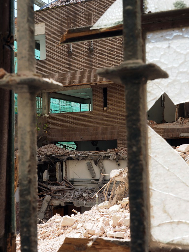 Antes de comenzar la obra los vecinos ya estaban preocupados por las consecuencias. El antiguo colegio está pegado a otro edificio que hace esquina en la calle Santa Lucia con Pizarro, y cerca de las viviendas y bajos de la Gómez Oreña. La antigüedad de éstos se une al peligro de la excavación necesaria para construir el garaje – 3 plantas de sótano- y sus habitantes ya adivinaban que tendrían problemas.